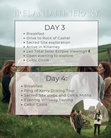 traveling to experience an eclipse in a land as ancient and spiritually rich as Ireland is truly rare. Eclipses mark powerful turning points. They bring endings, beginnings, and moments of clarity that can reshape how we see ourselves and our lives. Being physically present in Ireland during this eclipse gives us the opportunity to work intentionally with that energy, not just observe it. With the eclipse being at 94% totality, we will step outside around dinner, grab our eclipse glasses and integrate the energy into ritual.